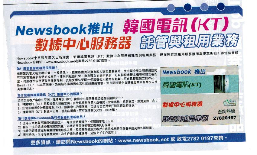 Newsbook推出 韓國電訊(KT)數據中心伺服器 託管與租用業務
